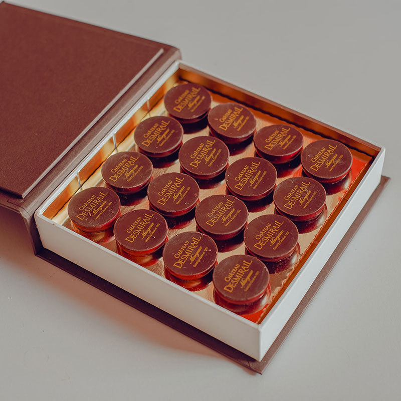 | Coffret | 4 chocolats, 9 chocolats, 16 chocolats, 25 chocolats, 4 chocolats + 1 bouteille 75 cl, 9 chocolats + 1 bouteille 75 cl |