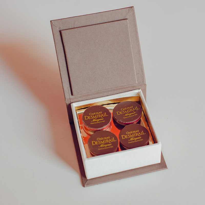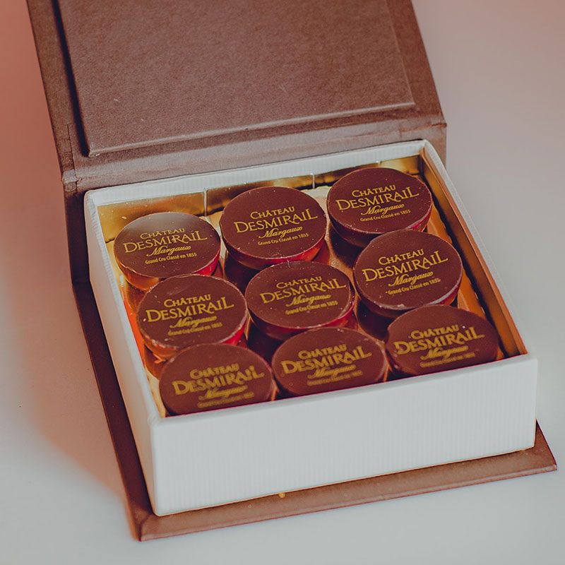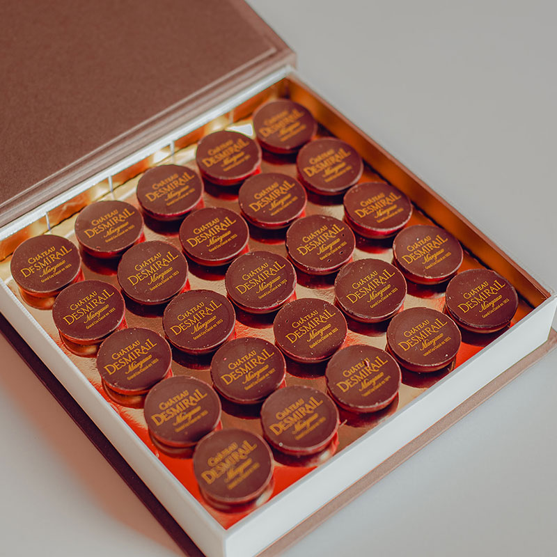 Craquez pour le chocolat noir 70 % de cacao Bacchus, croquant en surface et fondant en cœur. Ses notes intenses de cacao appellent un vin de caractère. Le Château Desmirail, 3ᵉ Grand Cru Classé 1855, incarne toute l’élégance de l’appellation Margaux. Sa vinification allie tradition et modernité pour donner un vin raffiné, à la fois accessible jeune et apte à la garde. Sa robe pourpre aux reflets grenat précède un nez élégant de fruits rouges, violette et épices douces. À l’aération, apparaissent des notes de fruits mûrs et un boisé subtil. En bouche, l’attaque est souple et la texture soyeuse. Les tanins ronds enveloppent la puissance du chocolat, offrant un accord équilibré et gourmand.